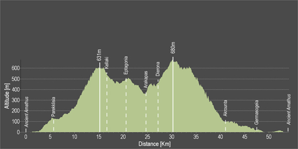 Eine reizende Tour, die von Amathus zunächst bergauf nach Parekklisia, einen schon vor 8.200 Jahren in der präkeramischen Jungsteinzeit besiedelten Flecken fürt. Um Kellaki eröffnen sich beeindruckende Blicke auf den Mount Olympus im Nordwesten. Ein entspannter Abschnitt führt westlich nach Eptagonia; von Arakapas über Dierona folgt ein erneuter Anstieg bis zum höchsten Punkt der Strecke auf fast 700 m ü. NN. Steil und kurvenreich geht es nach Akrounta – gerade im Sommer und Herbst eine grüne Oase – bis der Germasogia-Stausee erreicht wird und sich die Landschaft endlich wieder Richtung See öffnet. Ab hier folgen wenige, entspannte Kilometer zurück nach Amathus.