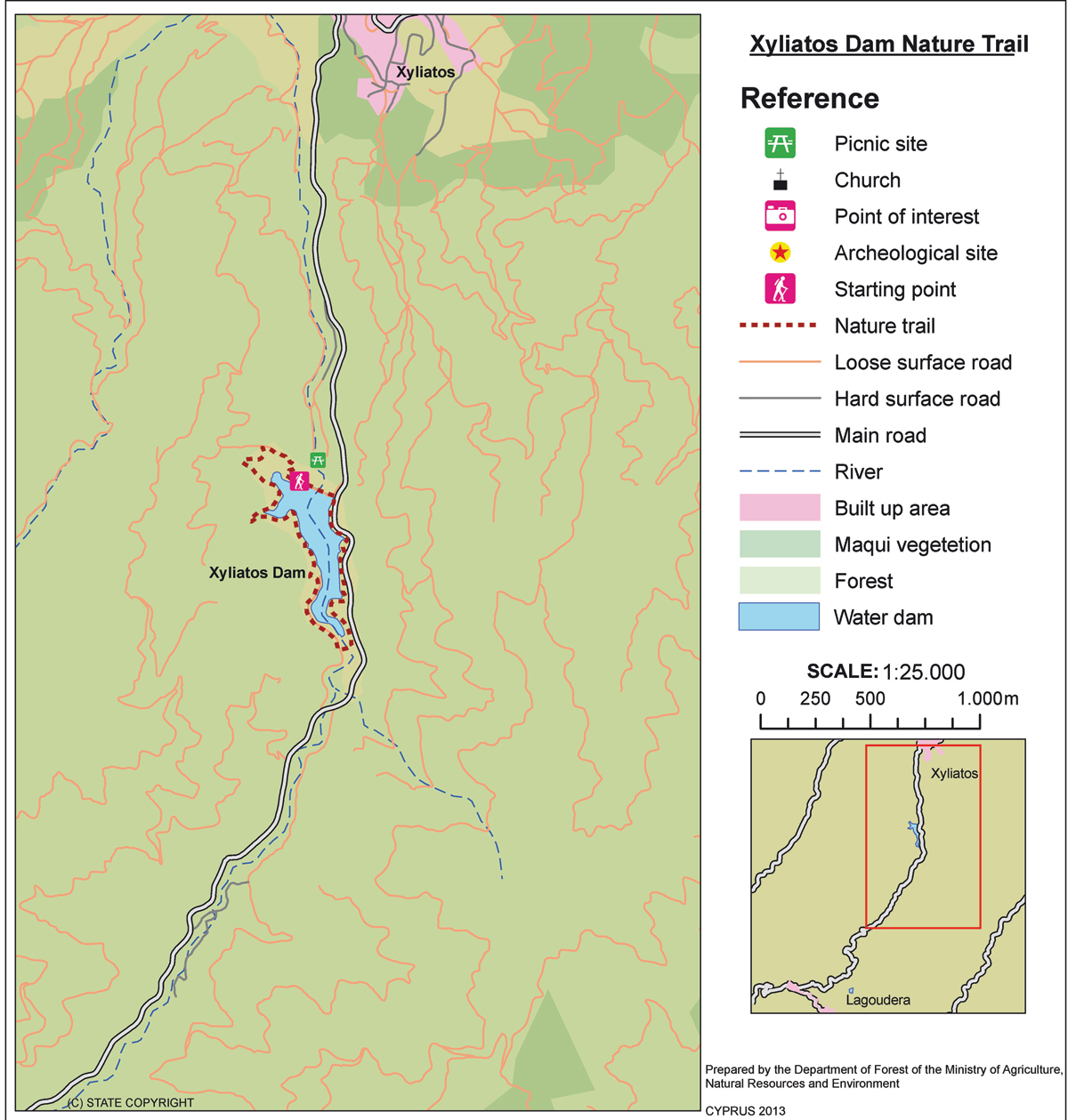 Centres d’intérêt: Le sentier débute au réservoir du barrage, en longe la rive jusqu’à son point culminant et le traverse. Le sentier poursuit son ascension jusqu’à la route de Xyliatos-Lagoudera, qui, si vous suivez la berge vous ramènera au point de départ. Le sentier rejoint un autre chemin de 200m de long qui débute à l’aire de pique-nique Fraktis tou Xyliatou (Barrage de Xyliatos), suit une petite portion de la route de Xyliatos – Lagoudera, pour rejoindre le sentier en boucle sur la berge du barrage. Le barrage en lui-même est digne d’intérêt. Une portion de sentier traverse une forêt de pins, de chênes dorés, arbousiers, myrtes, aulnes d’Orient et cistes.