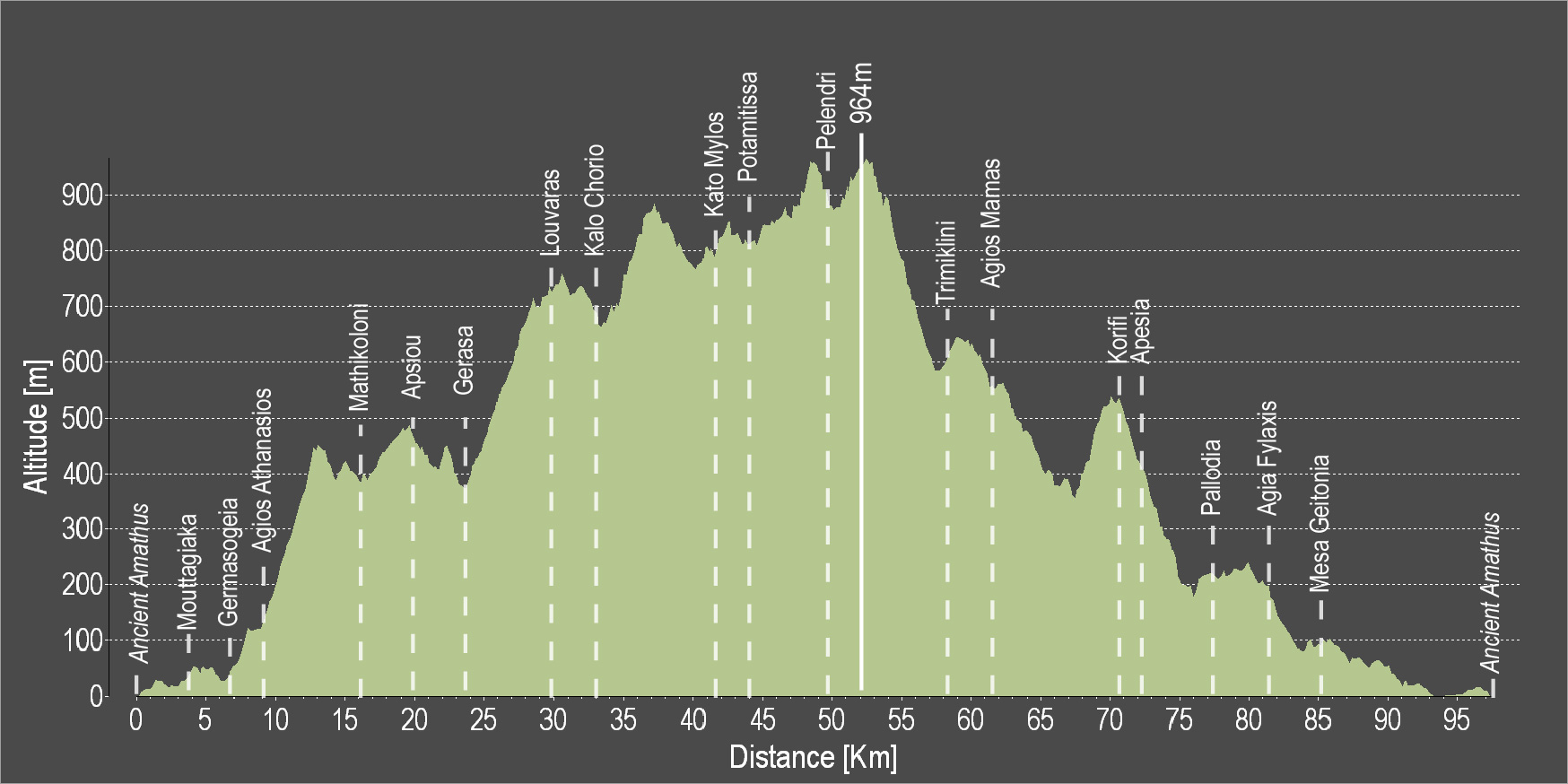 Η διαδρομή ξεκινά από Αμαθούντα, περνά από Γερμασόγεια και ανηφορίζει για Μαθηκολώνη. Αψιού και Γεράσα είναι τα επόμενα δύο χωριά για να φτάσουμε στο Καλό Χωριό. Η διαδρομή οδηγεί μέσα από την πευκόφυτη περιοχή όλο και πιο βόρεια στο γραφικό χωριό Ποταμίτισσα και στην συνέχεια στο μεγαλύτερο χωριό της περιοχής, το Πελένδρι. Μεγάλο κατήφορο θα μας οδηγήσει στον Σαϊττά και από εκεί ανηφορίζουμε για Άγιο Μάμα, Καπηλιό, Κορφή, Παραμύθα. Παλώδια είναι το τελευταίο χωριό πριν να φτάσουμε στην Λεμεσό και να κατευθυνθούμε προς το σημείο εκκίνησης στην Αμαθούντα.