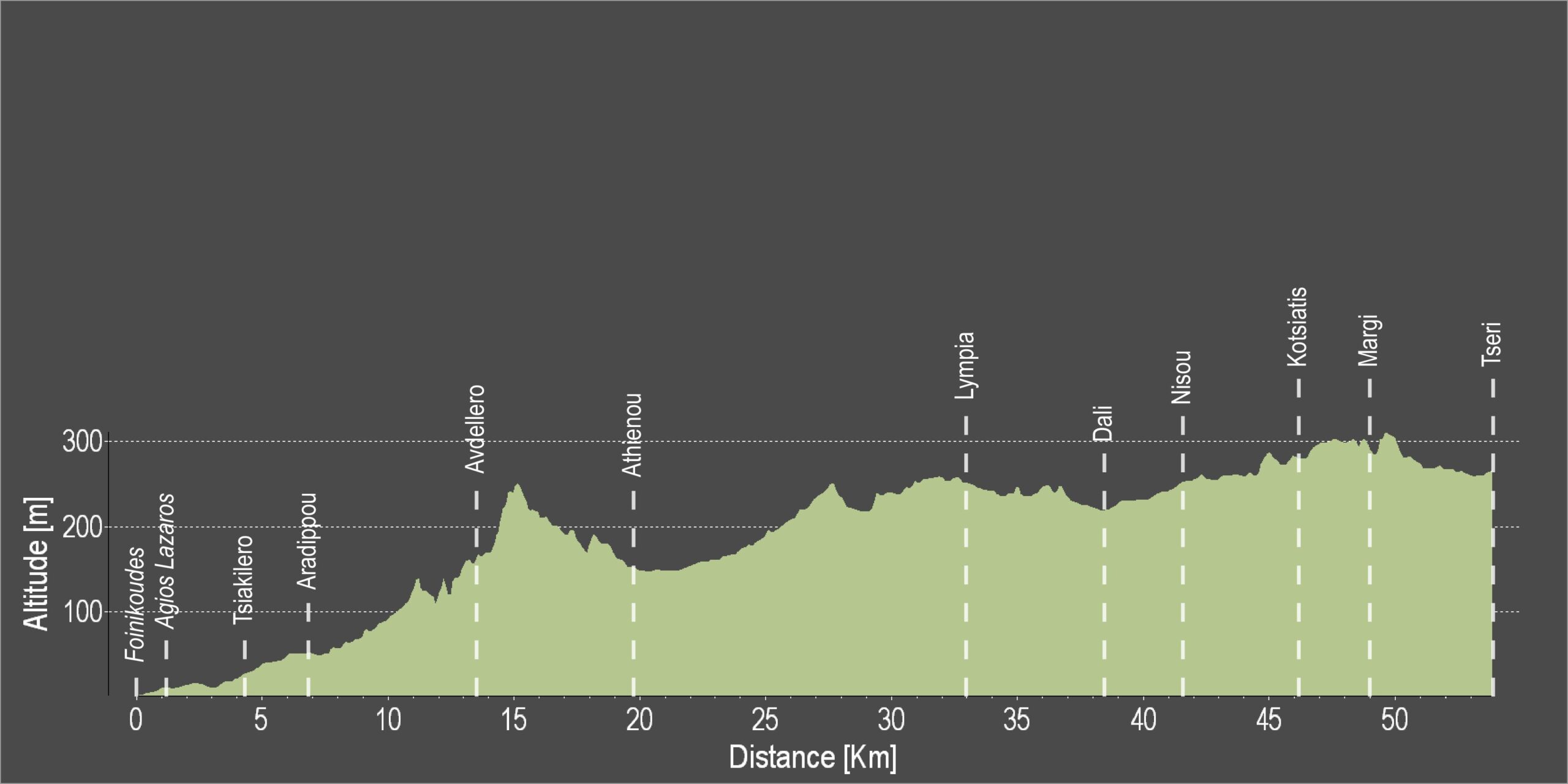 Au point de départ, au rond-point du port de Larnaka, aller vers l’ouest le long de l’avenue Stratigou Timagia, jusqu’aux feux de signalisation de Tsakkilero, obliquer direction nord-ouest vers le village d’Aradippou. Le traverser. Passer sous l’autoroute menant à Paralimni et, poursuivant dans la même direction, contourner le village d’Avdellero avant d’atteindre Athienou. De là, le parcours vire au sud, pour rejoindre la route secondaire qui relie Lefkosia à Larnaka, continuer jusqu’à l’intersection avec la route de Lympia sur la droite. S’orientant vers l’ouest à partir de Lympia, traverser les villages de Dali et de Nisou et passer sous la route reliant Lefkosia à Lemesos (Limassol), pour traverser les villages de Kotsiatis et de Marki. Puis se diriger vers le nord, traverser le village de Tseri pour arriver au rond-point de la rue Tseriou dans le quartier de Kokkines,  à l’entrée de Lefkosia.