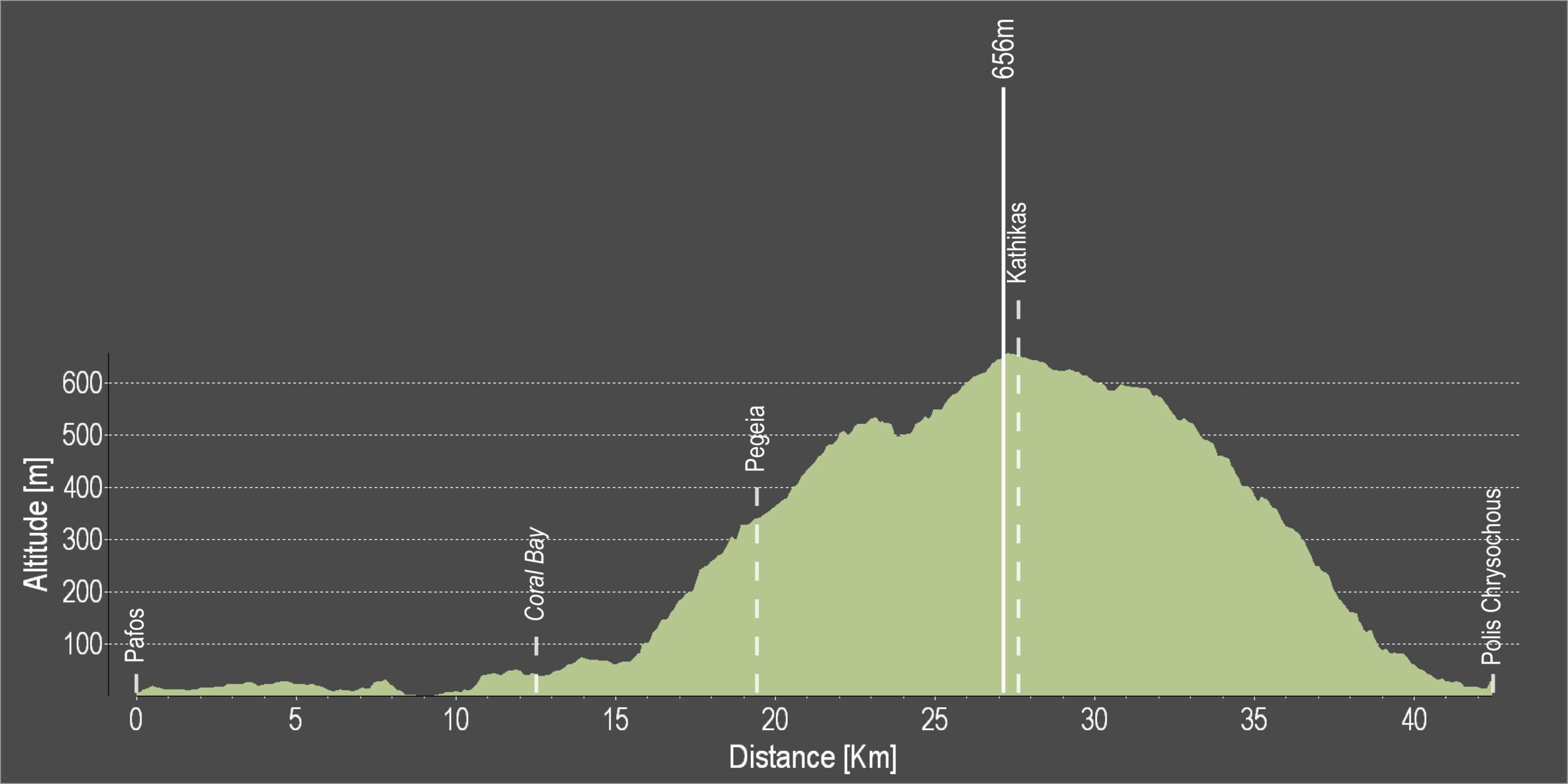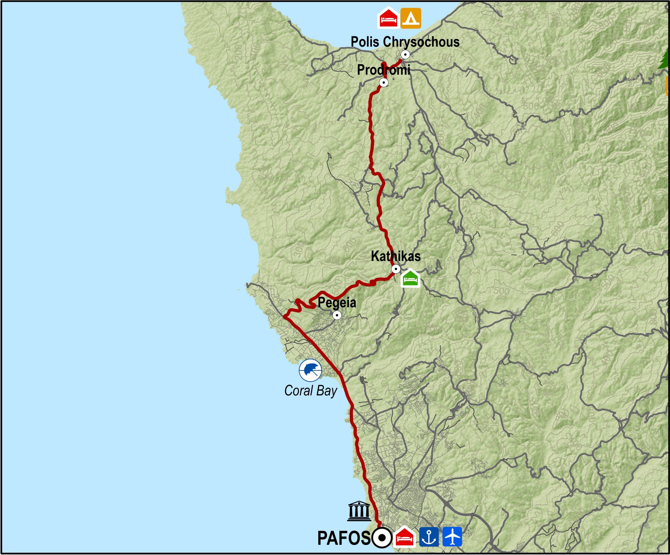En partant de Kato Pafos, suivre la route côtière en direction nord-ouest jusqu’au carrefour de Coral Bay, prendre à droite pour entamer l’ascension jusqu’au village de Pegeia, connu pour sa fontaine. La route grimpe à travers le village et offre une vue spectaculaire sur la côte ouest. Pénétrer ensuite dans la forêt pour atteindre Kathikas, puis Prodromi et enfin Polis.