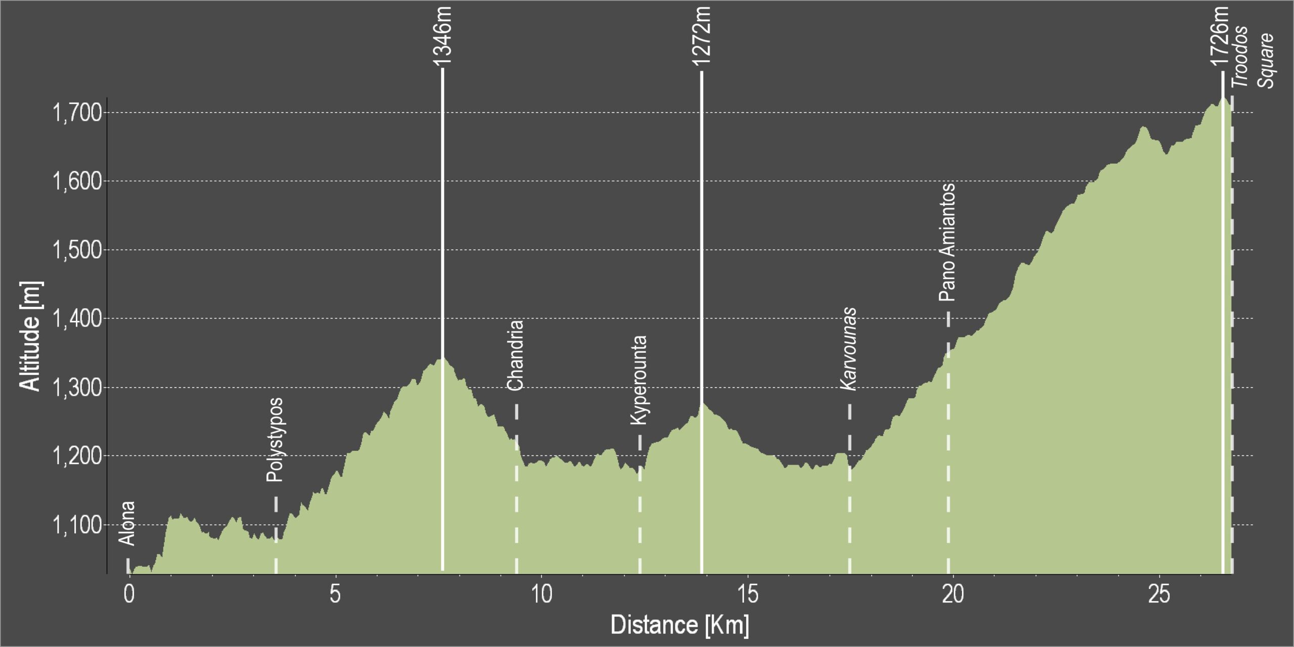 A partir du village d’Alona, en direction sud-ouest, traverser Polystypos, puis grimper vers le nord-ouest, passer sous le pic de Madari jusqu’au village de Chandria. A Chandria, tourner à droite, direction ouest, traverser Kyperounta, pour arriver au carrefour à Karvounas.