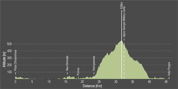 Au départ de Polis, longer la côte direction nord-est, jusqu’à Pachyammos, d’où le parcours dévie vers la droite, pour contourner l’enclave occupée par les Turcs de Kokkina. Lors de ce petit détour en direction sud, se laisser entrainer dans une ascension dans les montagnes, avant la descente permettant de rejoindre la route côtière vers Pyrgos.
