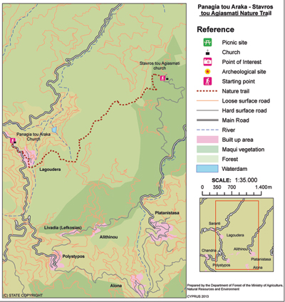 Centres d’intérêt: Le sentier suit la route forestière qui relie le monastère de Trooditissa au le village de Foini et offre, tout au long du sentier, une vue magnifique sur ce beau village. Le sentier traverse la rivière de Trooditissa et vous mène à la cascade Hantara (huit mètres de haut), puis passe devant des roches verticales avant de teriner le parcours sur la  la route Foini-Agios Dimitrios, à la sortie de Foini. L’intégralité du sentier se trouve dans le parc national forestier du Troodos, qui est un site du réseau Natura 2000.