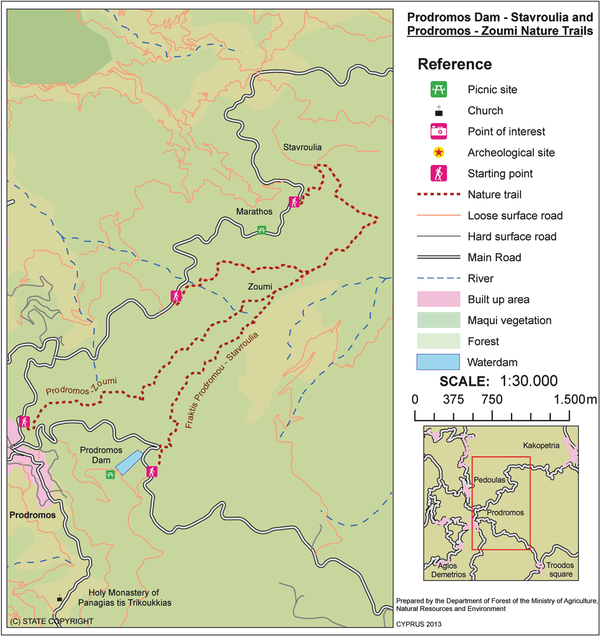 Centres d’intérêt: Le sentier offre une vue magnifique sur la baie de Morfou, la chaîne montagneuse du Troodos, et une vue panoramique des tunnels abandonnés d’anciennes mines de chrome. Le sentier traverse une forêt de pins noirs d’une extrême densité. Il se situe dans le Parc National Forestier du Troodos. Sur le versant ouest du barrage, on trouve l’aire de pique-nique «Fragma Prodromou» [signifiant «barrage de Prodromos» en français]; l’aire de pique-nique de Marathos, elle, est située sur la route Agios Nikolaos – Prodromos.