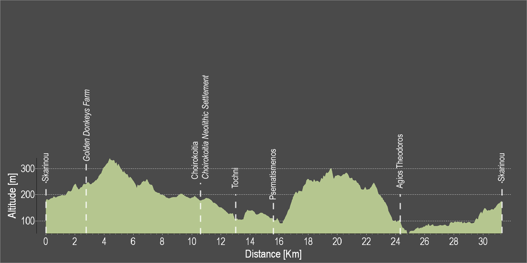 The route starts from the village of Skarinou and heads towards Choirokoitia, by passing by a donkey farm. At Choirokoitia, the Neolithic Settlement of Choirokoitia is located, which has been listed as a UNESCO World Heritage Site since 1998. The route then continues towards beautiful Tochni. Next follows the village of Psematismenos and then the route ascends and descends again towards Agios Theodoros and ends at the starting point in Skarinou.