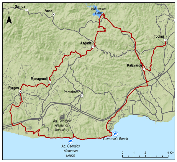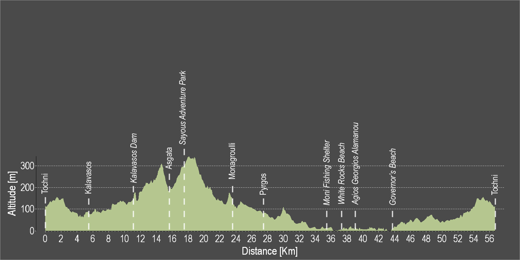 The route starts from the beautiful Tochni and heads towards Kalavasos. At a short distance from Kalavasos lies the Tenta Neolithic Settlement dating back to 7000 BC. It is one of the most important Neolithic Settlements on the island and is sheltered by a distinctive cone-shaped roof, which is a contemporary architectural intervention in the landscape. Subsequently, the route ascends towards the Kalavasos Reservoir. Next, discover the village of Asgata, then continue uphill to the adventure theme park and downhill again to Monagroulli and Pyrgos. The route continues along the coast, passing by the Moni Fishing Shelter, the impressive White Rocks coastal area, the beach of Agios Georgios Alamanos and the Governor’s Beach, to then head uphill and end in Tochni.